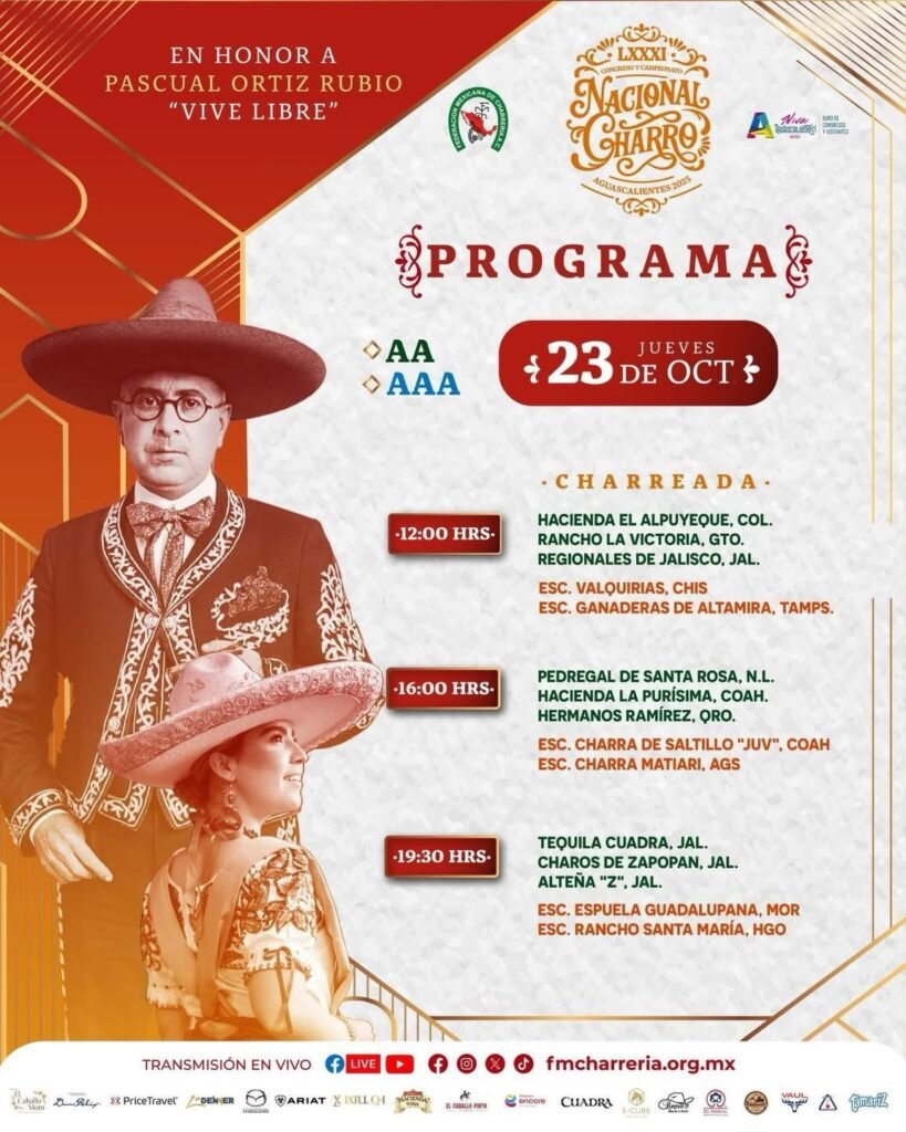 Otro Congreso Nacional Charro Aguascalientes 2025 ✅ PROGRAMA DE COMPETENCIAS | JUEVES 23 OCTUBRE LXXXI Congreso y Campeonato Nacional Charro “Pascual Ortiz Rubio – Vive Libre” 📍Arena San Marcos, Aguascalientes 🛜 Transmisión en vivo por Facebook Live y YouTube Post navigation Previous: MASTOGRAFÍAS GRATUITAS PARA MUJERES DE 40 A 69 AÑOS EN EL HOSPITAL DE LA MUJERNext: Gusanos “cola de rata” invaden calles de Poza Rica tras inundaciones; autoridades alertan sobre riesgos sanitarios Deja un comentario Cancelar respuestaTu dirección de correo electrónico no será publicada. Los campos obligatorios están marcados con *Comentario * Nombre * Correo electrónico * Web Guardar mi nombre, correo electrónico y sitio web en este navegador para la próxima vez que haga un comentario. Δ Related Stories Economía Noticias Otro La revolución sin efectivo llega al puesto de tacos Noticias Otro Descarrilamiento de tren en Aguascalientes deja un migrante muerto y varios heridos Noticias Otro Senado aprueba por unanimidad pensión por viudez para cónyuges y concubinos del ISSSTE