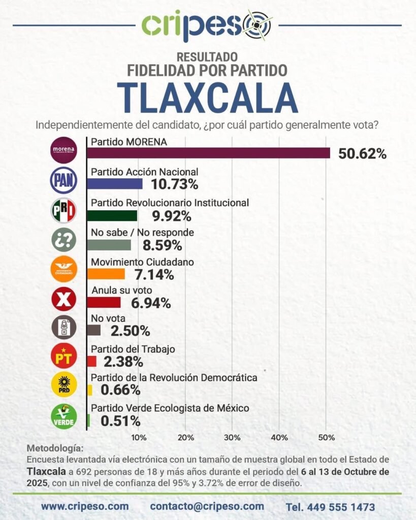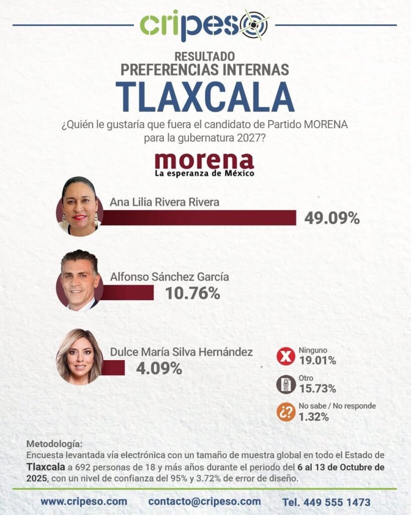 CRIPESO precisó que la Encuesta Gubernatura Tlaxcala 2027 se realizó a 692 personas mayores de 18 años, con un nivel de confianza del 95 % y un margen de error de ±3.72 %.