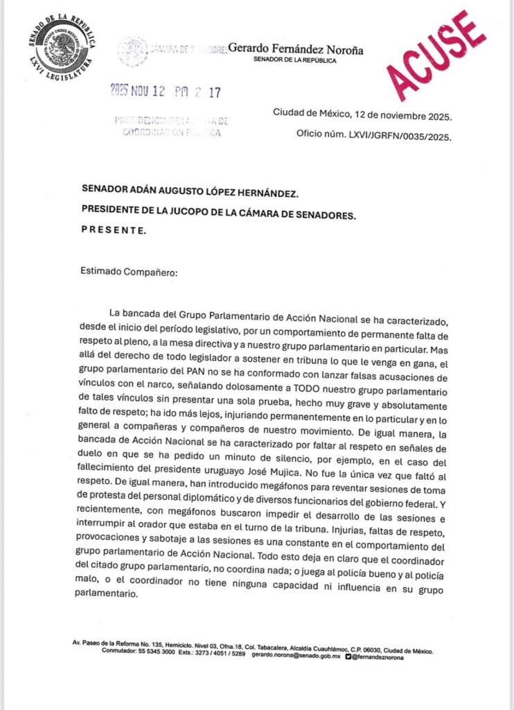El mismo Noroña que grita en tribuna ahora censura a la oposición que lo cuestiona por agenda. Desde julio, el PAN denuncia a Adán Augusto por presuntos nexos con “La Barredora”; Noroña responde callando voces.