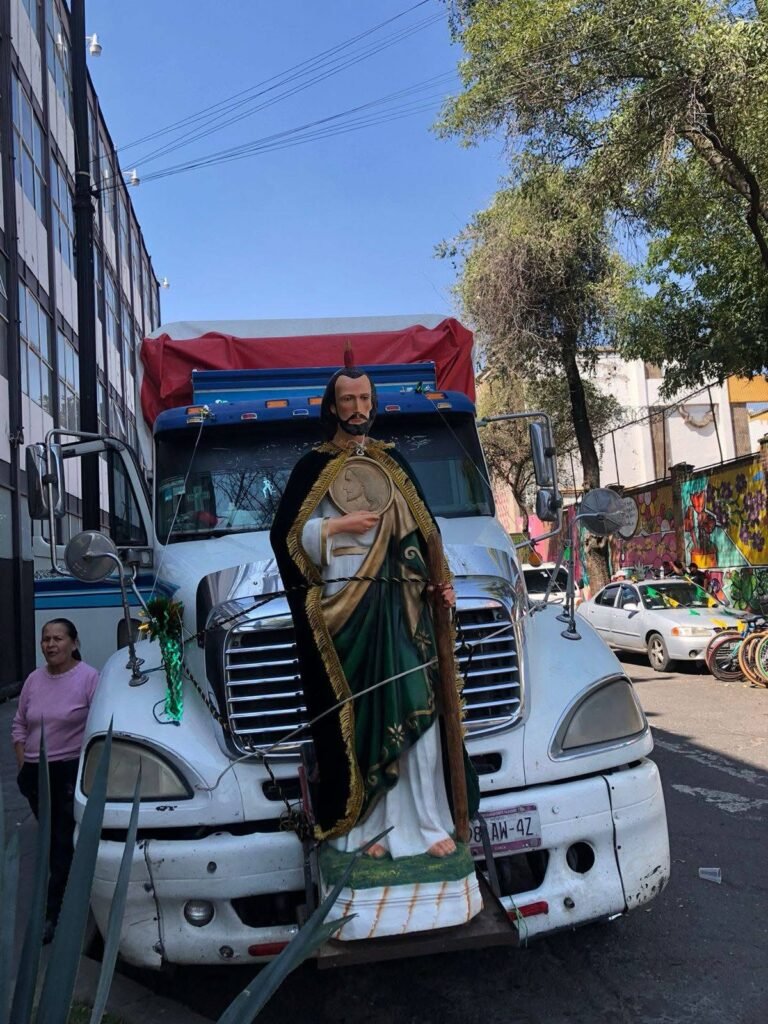 Ciudad de México, 28 oct 2025. — La calle Francisco Zarco se tiñó de verde fluorescente. Desde las 5:00-6:00 a.m., miles de devotos con sudaderas, playeras, banderas y estatuas del santo comenzaron a congregarse en el Templo de San Hipólito, epicentro de la capital, para honrar el Día de San Judas Tadeo, patrono de las causas imposibles, desesperadas y difíciles.