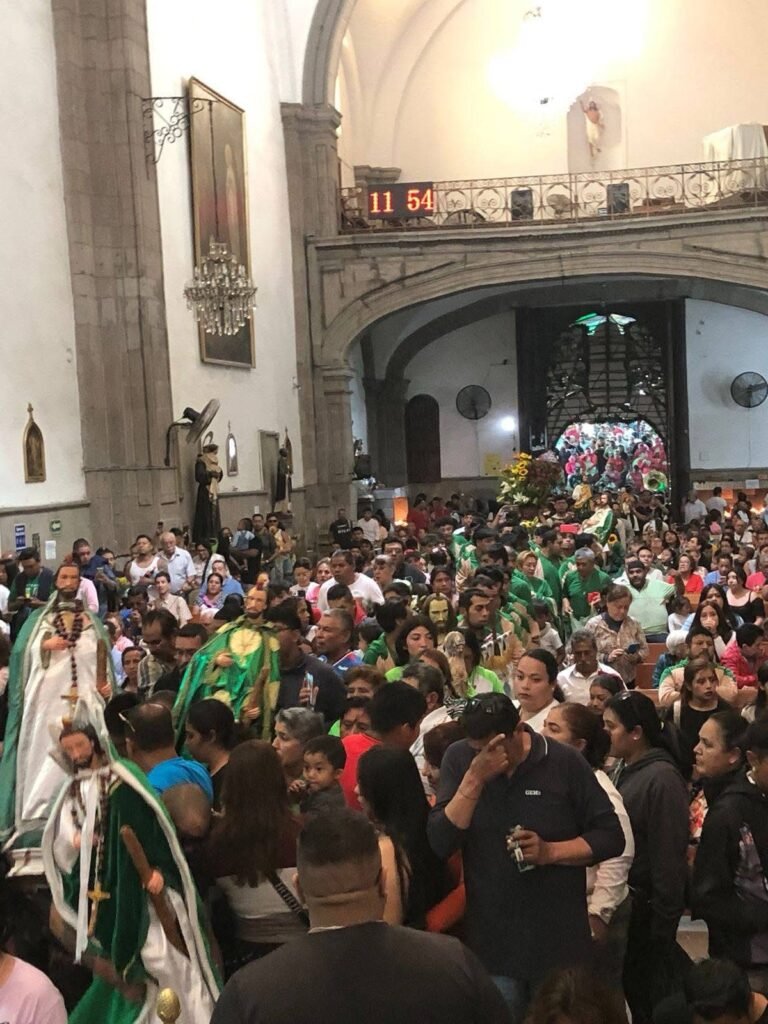 Dentro del templo, las misas se ofician cada 30 minutos desde las 5:00 a.m. hasta las 19:00 horas, con bendición de imágenes a las 20:00. La efigie principal, ataviada en túnica verde y oro, acumula flores, cartas, fotos y veladoras de peticiones por empleo, salud o justicia. La jornada culmina con mañanitas de mariachi a medianoche y una procesión nocturna a las 20:00 horas; hay transmisión en vivo para devotos remotos.