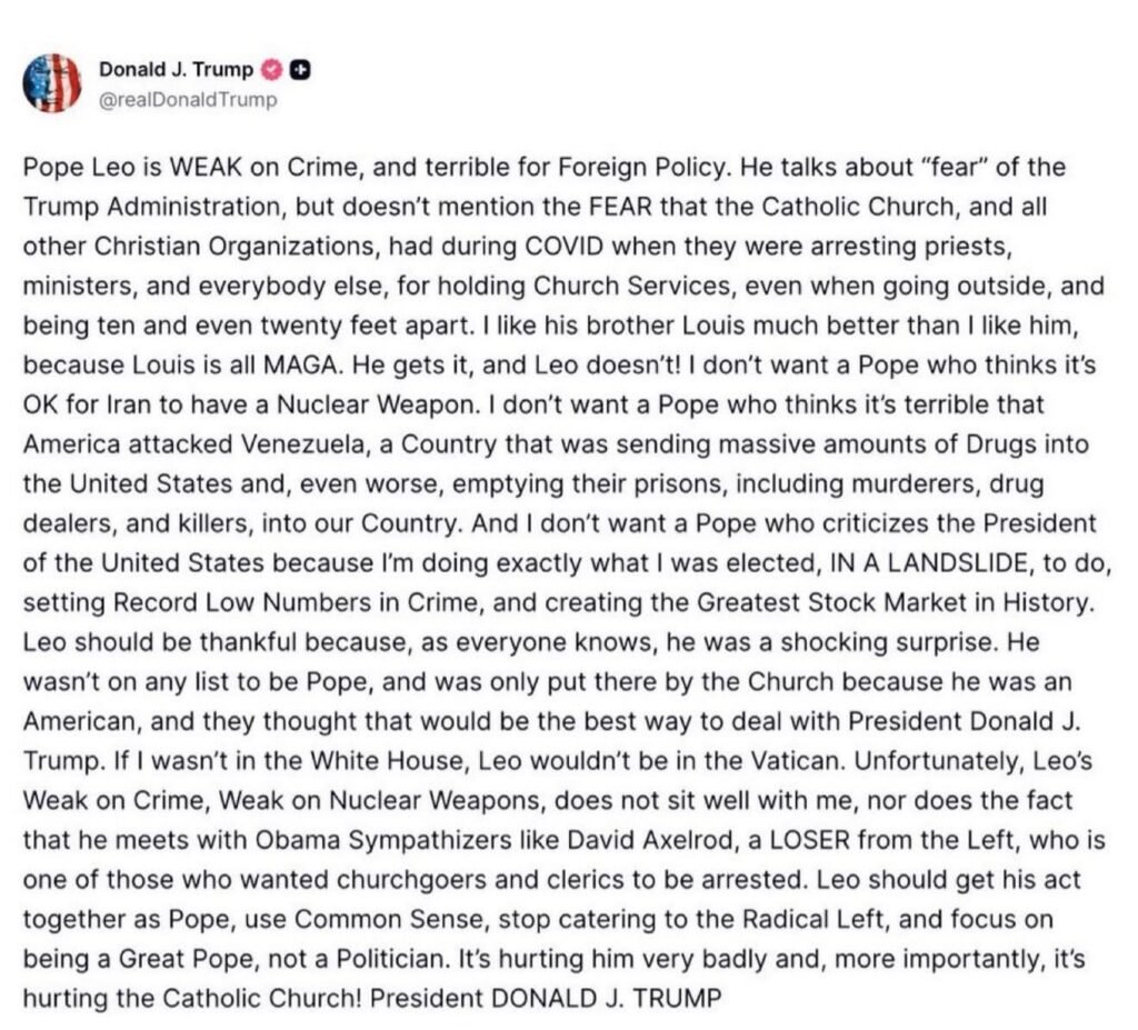 En su mensaje, Trump escribió: “No quiero un papa que piense que está bien que Irán tenga un arma nuclear. No quiero un papa que considere terrible que Estados Unidos haya atacado a Venezuela, un país que enviaba cantidades masivas de drogas a EE.UU. y, lo que es peor, vaciaba sus prisiones, incluyendo a asesinos, traficantes de drogas y homicidas, para enviarlos a nuestro país”.
